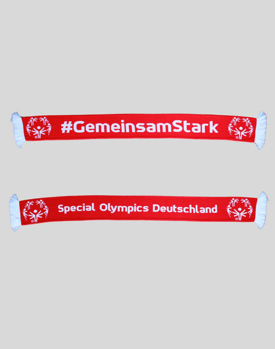 Mit unserem roten Special Olympics Deutschland Schal hast du den perfekten Fanartikel. Er ist weich und wärmend. Neben dem klassischen Special Olympics Deutschland Schriftzug ist der Schal auch mit unserem Hashtag #GemeinsamStark bestickt. Er hält dich immer wohlig warm.